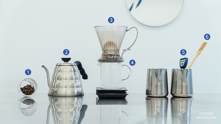 ❶ 브루클린 컴포트 원두 18g ❷ 드립포트, 뜨거운 물 ❸ 클레버, 여과지(칼리타 또는 멜리타 필터) ❹ 드립서버, 저울 ❺ 온도계 ❻ 교반스틱